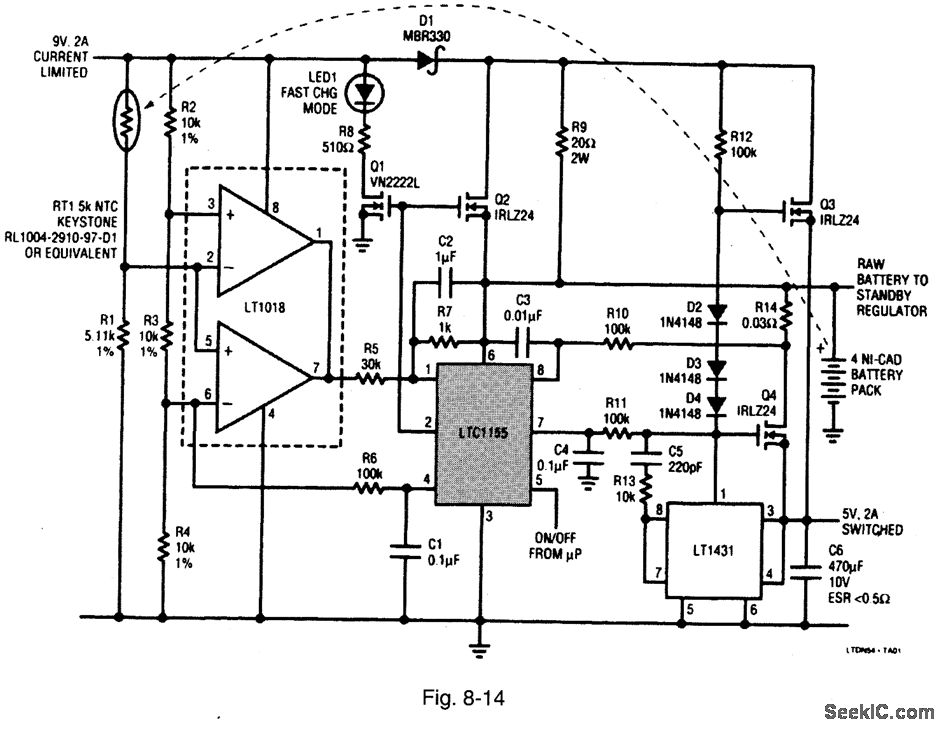 Figure 8-14 Shows an LTC1155 dual-power MOSFET driver connected to providecontrol of a four-cell charger/regulator. The LTC1155 has the ability to deliver 12-V of gate drive to two N-channel power MOSFETs when powered from a 5-V supplywith no external component required, The circuit is suited for a notebook-computer supply.(A four-cell NiCad battery pack can be used to power a 5-Vnotebook computer.)Q3 and Q4 must be provided with heatsinks.The regulator ISswitched off by the microprocessor when the battery voltage drops below 4.6V The standby current for the 5-V 2-A regulator is less than 10 μA.The regulator is switched on agam when the battery voltage rlses during charging. LINEAR TECHNOLOGY, DESIGN NOTE 51 P.1