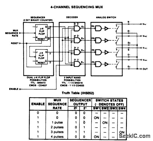 Four-channel sequencing multiplexer. The analog switch package is an Intersil IH5052 16-pin CMOS DIP (courtesy Intersil, Inc.).