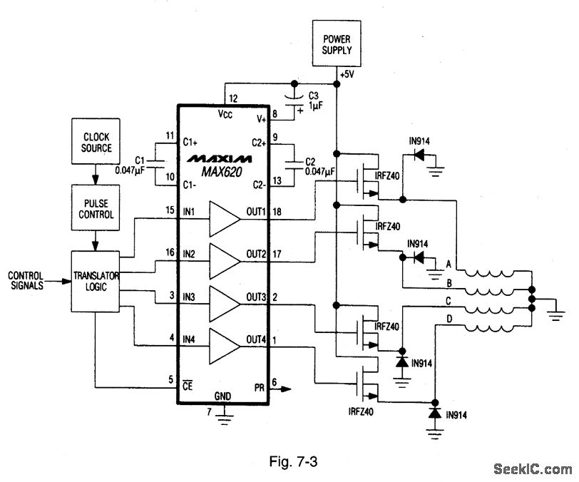Figure 7-3 shows a MAX620 connected to form a complete stepper-motor drive. TTL/CMOS signals from the logic network are translated to high-side levels that drive four N-channel power MOSFETs, supplying current to each of four stepper-motor phases. The diodes provide a discharge current path for the stepper-motor windings. MAXIM NEW RELEASES DATA BOOk, 1992, P. 4-28.
