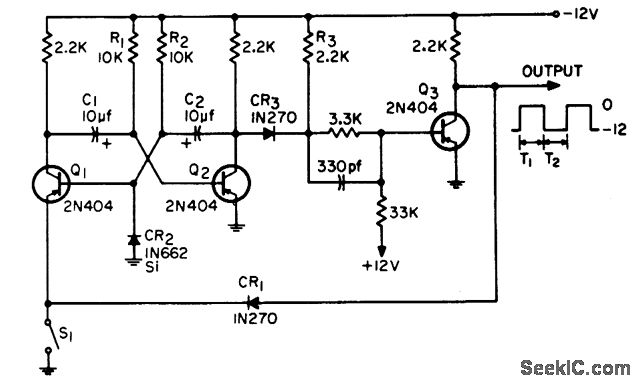 Uses standard logic circuits with self-completing action to produce pulse train having any desired integral number of pulses. First pulse starts when S1 is closed, and last pulse is completed when S1 is open. Selfcompleting action is produced by or function of S1 und CR1.-M. Neidich, Self-Completing Gated Astable, EEE, 13:1, p 66 and 75.
