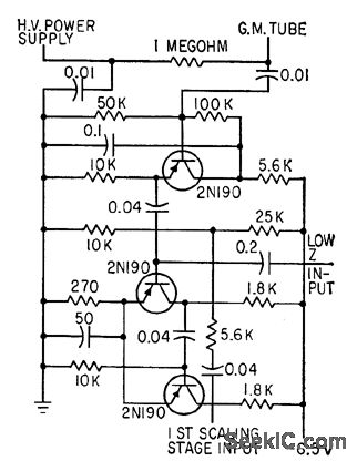 Shapes pulses from Geiger-Muller tube and uses one-shot mvbr to drive first scaling stage.-F. E. Armstrong, Battery Powered Portable Staler, Electronics, 33:19, p 74-75.