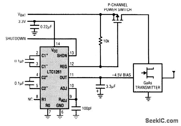 Cellular telephones and other mobile communications gear use depletion-mode GaAsFET RE output transistors, which require a negative bias voltage for proper operation. This LTC1261 circuit generates a regulated negative voltage using no inductors, and will give plenty of drive for GaAsFET bias circuits. The LTC1261CS8 inverts the supply voltage (5 V to -4.5 V), whereas the LTC1261CS can invert or double the supply voltage (3 V to -4 or -5 V). Both parts regulate the generated output voltage. The quiescent current is just 600 μA, and the shutdown current is only 5 μA. The combination of high oscillator frequency, which reduces the switched capacitor size, and the variety of fixed-output regulated negative voltages allows for a minimum-space power supply. The LTC1261 comparator output controls a P-channel MOSFET to ensure that the drain current for the GaAsFET is switched off until the regulated negative output voltage is valid. This ensures that the gate voltage is sufficient to keep the GaAsFET off during power-up, preventing unsaturated operation and excessive operation.