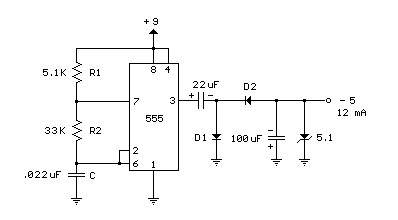A 555 timer can be used to generate a squarewave to produce a negative voltage relative to the negative battery terminal. When the timer output at pin 3 goes positive, the series 22 uF capacitor charges through the diode (D1) to about 8 volts. When the output switches to ground, the 22 uF cap discharges through the second diode (D2) and charges the 100 uF capacitor to a negative voltage. The negative voltage can rise over several cycles to about -7 volts but is limited by the 5.1 volt zener diode which serves as a regulator. Circuit draws about 6 milliamps from the battery without the zener diode connected and about 18 milliamps connected. Output current available for the load is about 12 milliamps. An additional 5.1 volt zener and 330 ohm resistor could be used to regulate the +9 down to +5 at 12 mA if a symmetrical +/- 5 volt supply is needed. The battery drain would then be around 30 mA.