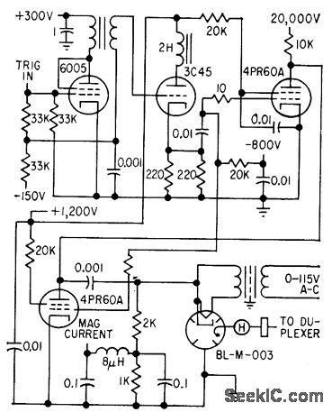 Supplies 0.02-microsec 180-kw modulating pulses at prf of 14,400 pps. Hard tube is used because hydrogen thyratron of adequate power-handling capability would not deionize rapidly enough at this prf.-R. F. P. Smith, Airport Radar Has High Resolution, Electronics, 32:14, p 64-69.