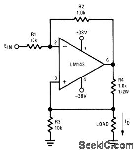 Non-inverting input of LM143 high-voltage opamp senses current through R4 to establish output current that is proportional to input voltage. With ±38 V supply, compliance of current source is ±28V. - Linear Applications, Vol. 2, National Semiconductor, Santa Clara, CA,1976, AN-127,p3.