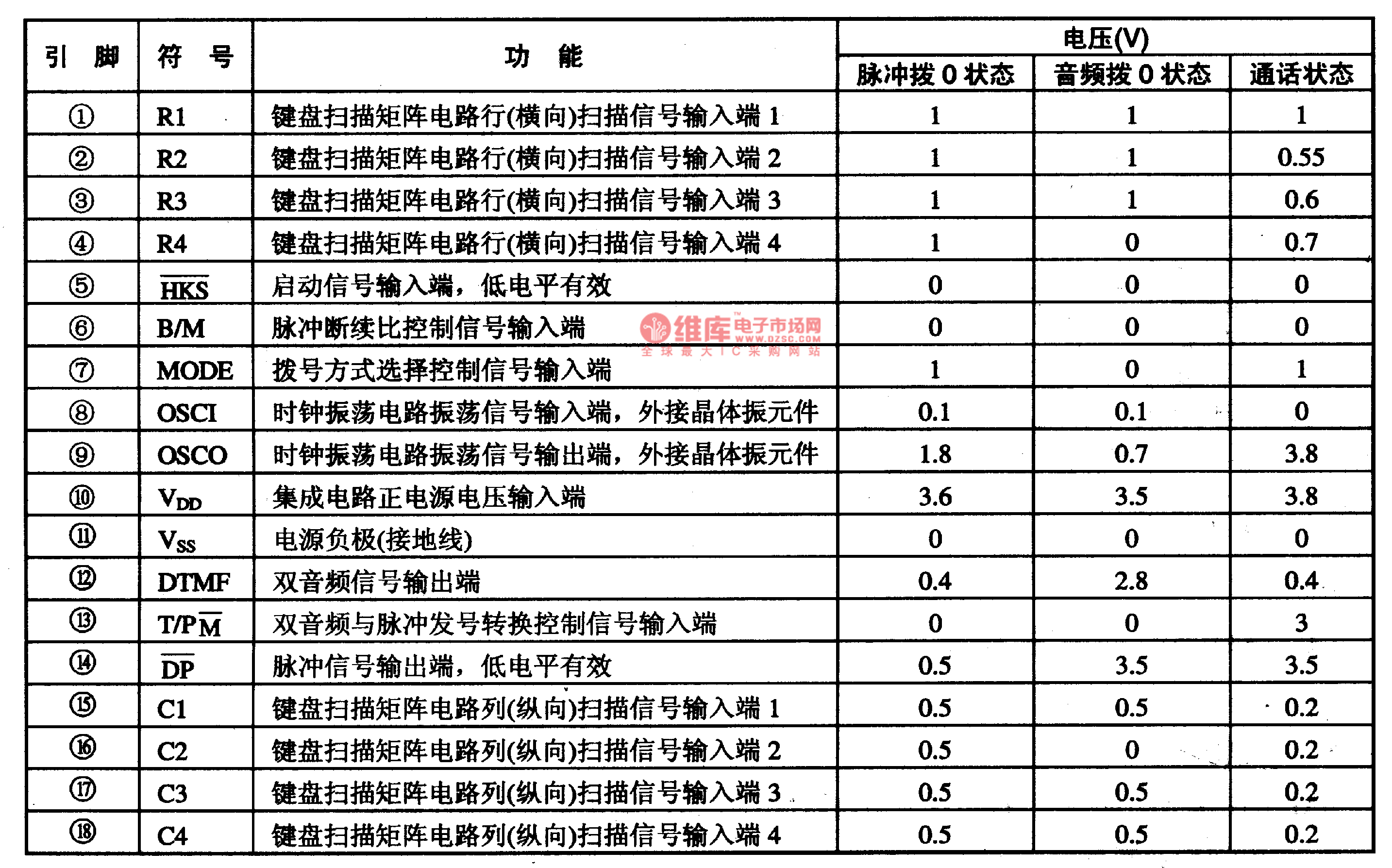 Table 1-1 pin functions and data of the HM9102A/D pulse/two-tone audio dialing circuit