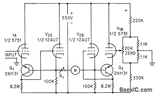 Transistor in each side of balanced vtvm reduces output impedance to fraction of ohm, making meter reading independent of aging of tubes.-J. J. Faran Jr., Hybrid Voltmeter Avoids Aging Errors, Electronics, 36:38, p 41.