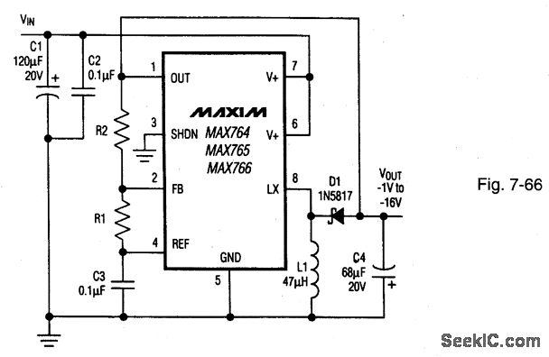 Figure 7-66 shows the MAX764/65/66 connected to provide inverter operation with an adjustable output (-1.0 V to -16 V). For adjustable operation, let R1= 150 kΩ, then find the value of R2 using: Where VREF = 1.5 V. See Fig. 7-65 for component suppliers. MAXIM NEW RELEASES DATA Book, 1995, P. 4-121.