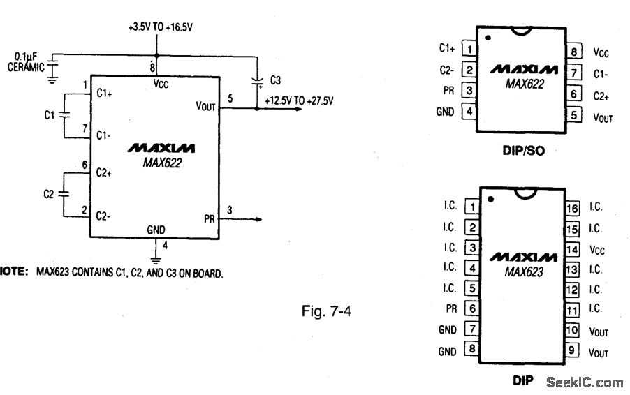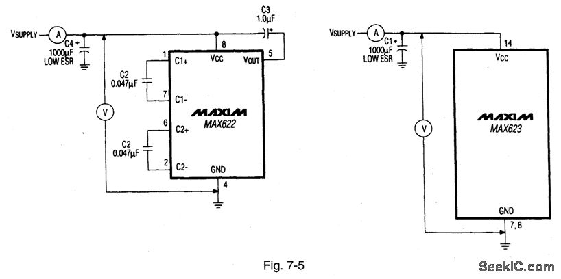 Figure 7-4 shows a MAX622 connected to generate a regulated output voltage thati s 11 V greater than the input supply voltage. The primary use is to power high-side switching and control circuits.The output current is 25 mA. with a typical qulescentcurrent of 70 μA. Figure 7-5 shows quiescent Supply current test circuits. The MAX623 has internal charge-pump capacitors.The logic level PR (power ready) output indicates when the high-side voltage reaches the proper level.MAXIM NEWRELEASES DATA Book 1992 P. 4-31 4-37.
