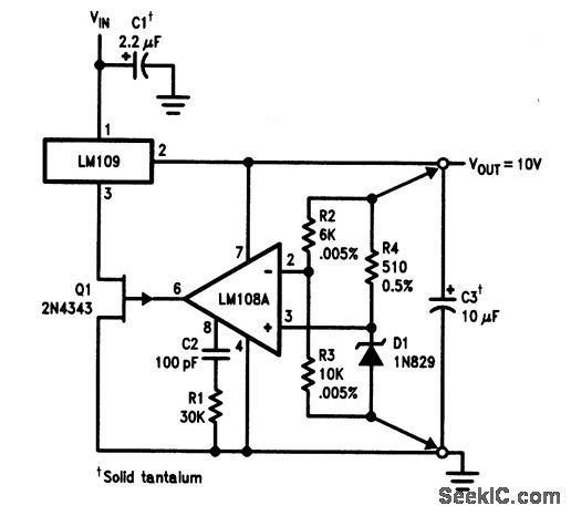 The load and line regulation of this circuit is better than 0.001%.Noise, drift, and long-term stability are determined by Zener D1. Noise can be reduced by inserting 100-kΩ resistors in series with both inputs of the LM108A, and bypassing the noninverting input to ground. A 100-pF capacitor between the LM108A output and the inverting input prevents frequency stability. Temperature drift can be reduced by adjusting R4 for minimum drift. For best results, remote sensing should be made directly to the load terminals, as shown.