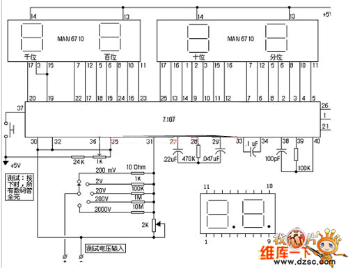 ICL7107 is a widely used integrated circuits. It contains a 3 1/2 bit digital A/D converter, which can directly drive LED digit pipes, and in it there sets the reference voltage, independent analog switch, logic control, display drive, auto reset functions and so on. Here, we introduce a type of its application circuit production--the digit voltmeter, and its circuit is in the figure. When we manufacture it, we choose the common positive digit pipes as the display, the multiple turn resistor as the 2K adjustable resistor and the metal film resistor with little difference as the divider resistor.