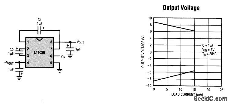 Localized generation of bipolar supply rails is useful in many op-amp, data-conversion, and interface applications. To avoid the design time and effort of putting together a switching regulator circuit, switched-capacitor conversion should be considered as a simple, effective alternative. The LT1026 is shown here in a useful application circuit that can generate rail voltages of both polarities from a 5-V logic supply. Output voltage will vary with load (as shown on the graph), from ±9 V at minimal load currents to ±6 V at a load current of 15 mA. These boosted rails can be used to extend comrnon-mode input and output ranges of circuits without doing level shifting, ac coupling, or signal clipping. Because the LT1026 is supplied in an eight-lead SO package, the entire circuit can be surface-mounted using tantalum or ceramic capacitors.