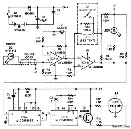 Infrared light detected by photodiode D2 is amplified by IC1-a. The value of R2 can be changed to decrease the sensitivity of the circuit, if your application demands it. Connector J1 provides an output to an oscilloscope for the display of the amplified photodiode signal. This is handy when checking the pulsed emitters in most remote controls. Voltage comparator IC1-b squares up signals from IC1-a to digital logic levels for IC2-a. LED1 and current-limiting resistor R7 indicate the presence of steady-state infrared and also function with pulsed emitters if the duty cycle is appropriate Monostable multivibrator IC2 conditions pulse trains with any period shorter than the time constant of R9 and C1 into a low-frequency waveform with a very high duty cycle. This provides pulses for LED2 that are constant in frequency and duty cycle, regardless of the high input frequency to IC2-a.Any frequency input to IC2-a with a period longer than the time constant of R9 and C1 creates IC2-b output pulses with the same width as before at the input frequency. Tricolor LED2 (a dual red/green device) functions as a pilot lamp and indicator for pulsed infrared sources. LED2 will always glow red and pulse amber (red + green) when infrared pulses are detected. The power source for the circuit is a 9-V battery. Alkaline batteries will provide many hours of operation because the circuit has low-power integrated circuits in place of S2 for most emitters. For certain devices, such as slotted optical switches, CD laser diodes, and reflective sensors, more sensitivity might be desirable. If you plan to use the probe for LEDs that operate below 0.5 mW, install S2 and R13-if not, you can in-stall a wire jumper on the board instead of the switch.