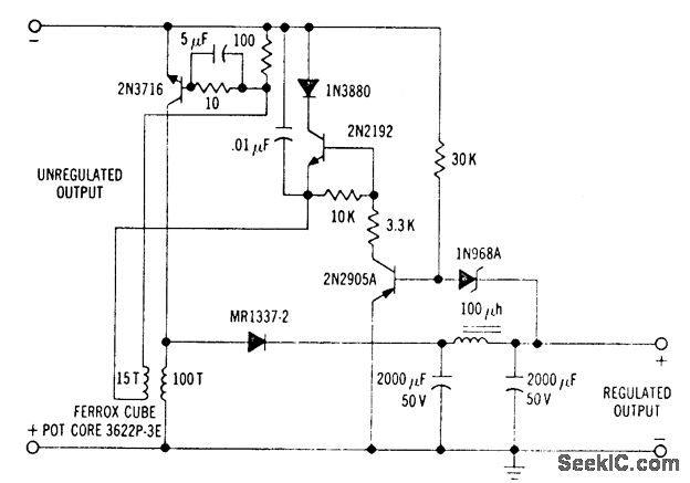 Simple 6-kc blocking oscillator circuit serves both for sensing and duty cycle control. Arrangement is more efficient than conventional series-pass regulators. Inverted polarity is added feature. Will regulate 20-v output within 1% overload range of 50 ma to 1 amp.-H. Weber, Two Unique Switching Voltage Regulators Using Blocking Oscillators, Motorola Application Note AN-163, Aug. 1965.