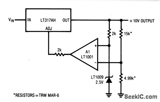 This circuit shows a way to increase the stability of regulator output over time and temperature. The circuit is particularly useful in powering strain-gauge transducers (chapter 14). The output voltage is divided down and compared to the 2.5-V reference by A1, which, in turn, forces the adjustment pin to whatever voltage is required to maintain the 10-V output.