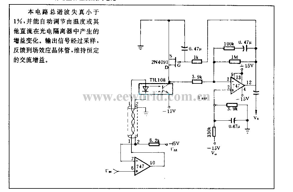 The total harmonics distortion of this circuit is lower than 1%, and it can automatic regulation the gain variations which is produced by temperature or other DC in photoelectric isolator. After sampling, the output singal is fed back to FET, to keep constant AC gain.