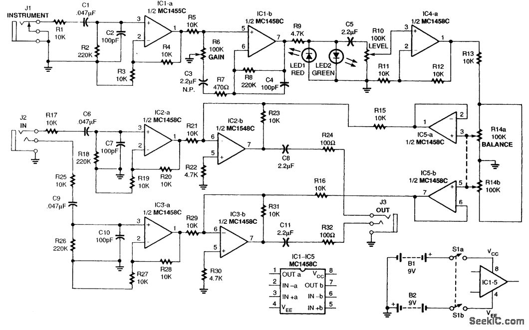 Here is the schematic diagram for JamMix. Note that nine out of ten sections from five MC1458C dual op amps are used. The INSTRUMENT jack, J1, provides a signal to IC1-a, which is a noninvert-ing buffer amplifier with a gain of 2. The gain is determined by R3 and R4. The amplified instrument signal is fed to audio-gain stage IC1-b, which is controlled by potentiometer R6. The circuit location of control R6 provides a desirable interplay with volume control on the guitar. Whenever the output of IC1-b exceeds about 2V p-p, light-emitting diodes LED1 and LED2 begin to illuminate and clip the audio signal, providing a high-quality distortion effect. The LEVEL control, RIO, sets the level of the output of the high-gain distortion stage IC4-a, which, in turn, drives the ganged potentiometers (R14a and R14b). Unity-gain amplifiers IC5-a and IC5-b feed summing amplifiers IC2-b and IC3-b, which in turn drive the external load connected to stereo OUT jack J3. The load can be either stereo headphones or additional external stages used for audio amplification. Integrated-circuit sections IC2-a and IC3-a are noninverting amplifiers, each with a gain of 2. Their inputs are the line-level stereo input signals, each having a gain of 2. Their outputs mix with the instrument signal in ampli-fiers IC2-b and IC3-b; both of these amplifiers also have a gain of 2.