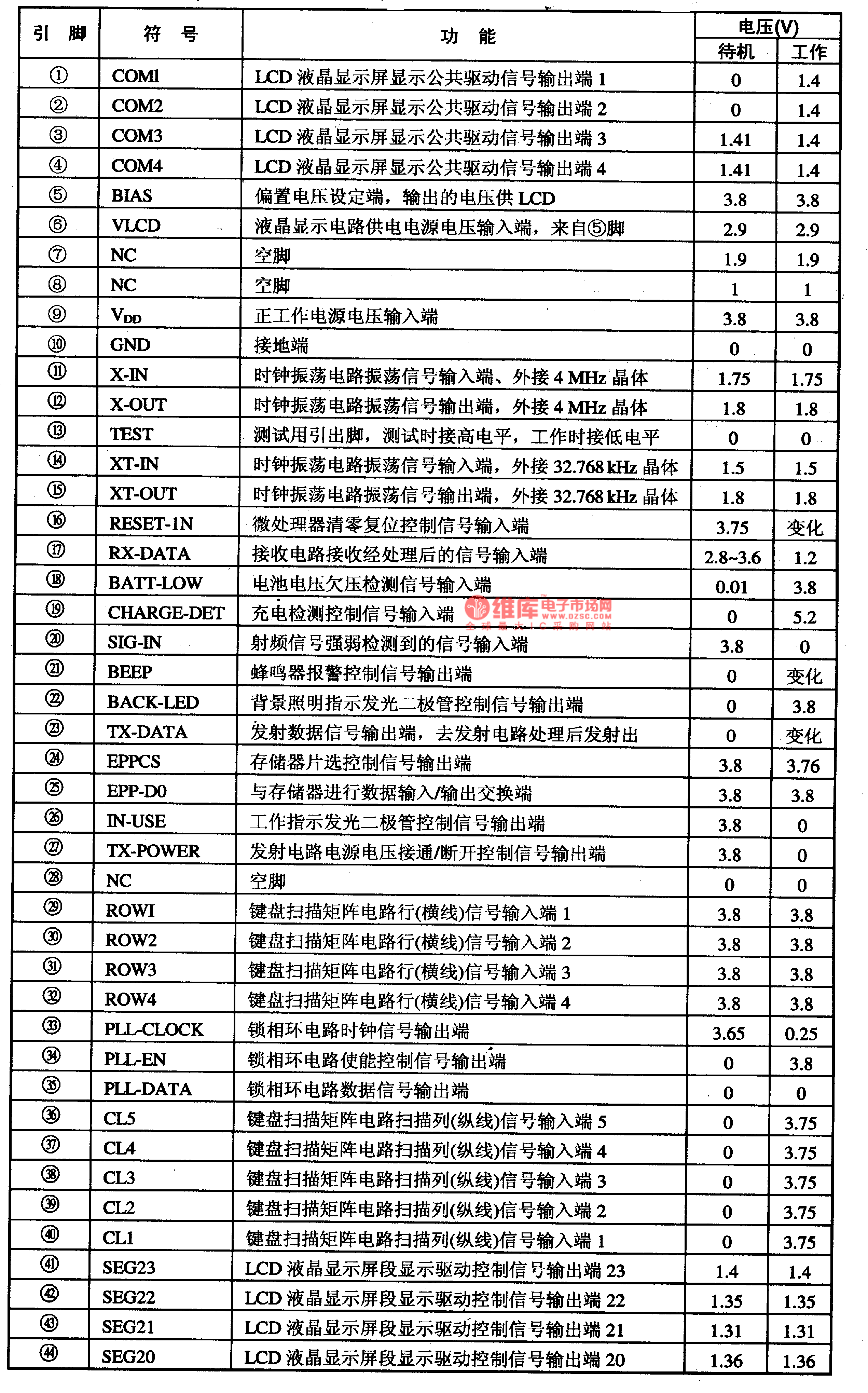KW8889 is a communication single chip microcomputer integrated circuit, which is widely used in caller display telephones.1.function introductionKW8889 contains the wireless emitting and receiving control circuit, key switch encoding circuit, RF intensity detection circuit, LCD display drive control circuit, storage connector circuit, background lighting indication control circuit, PLL circuit, 2 teams of clock oscillating circuit, charge detection and battery low voltage detection circuit, buzzer drive control circuit and so on.2.pin functions and data