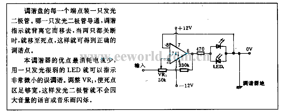The advantage of this tuner is minimum current consumption, even using a very weak LED, it also can indicate tiny mistaken tuning. To adjust VR1, broaden tuning point zone enough, then LED will not flashing because of the loud language or music.