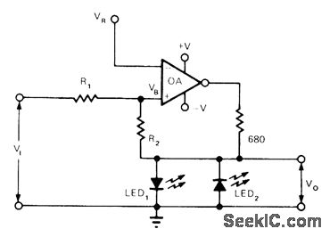 Visual indication of voltage level is achieved with two TIL203 LEDs, three resistors, and any opamp that can provide 15-mA output current. If input voltage momentarily or permanently exceeds most positive reference level, LED1 is switched on. If voltage falls below negative or least positive reference level, LED1 goes off and LED2 comes on. Article gives design equations for determining values of R1 and R2. For levels of +2 V to turn LED1 on and -1.2 V to turn LED2 on, both R1 and R2 are 10K.-E. J. Richter, Op Amp Makes Visual Level Indicator, EDN Magazine, May 5, 1974, p 73.