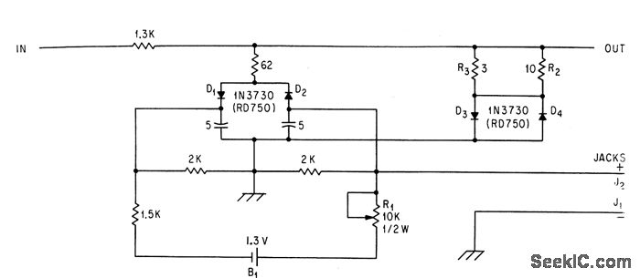 Output of pas sive circuit is proportional to log of input voltages between 0.1 and 100 v. Serves for either positive or negative pulses.-C. D. Nail, Logarithmic Attenuator Spans Three Decades, Electronics, 36:46, p 47-48.