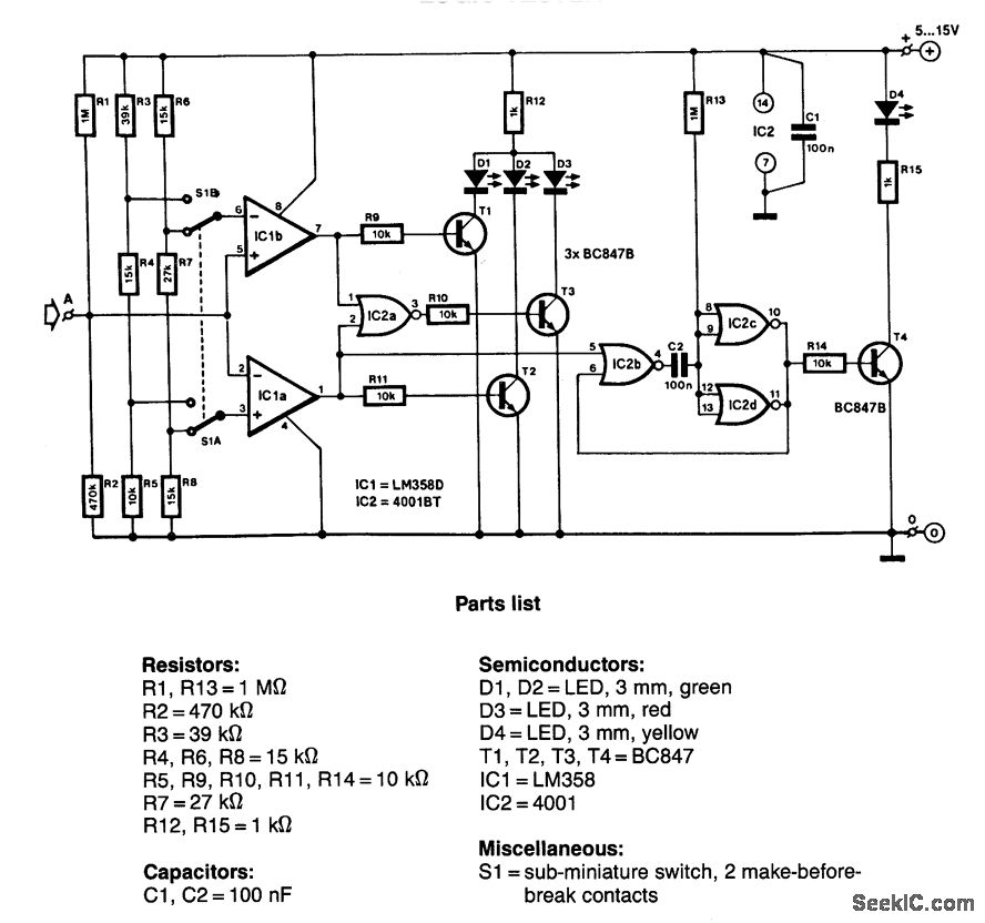 The comparators are followed by driver stages, T1 and T2, for the LED display (D1 for high and D2 for low ) and also NOR gate IC2A that switches on T3 when the output of both comparators is low, that is, when it is undefined. This state is indicated by D3.