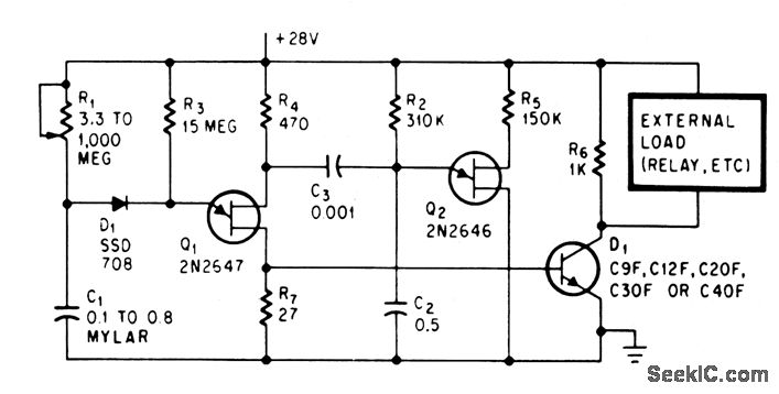 Delays up to 2 hours are obtained, using unijunctiom transistor Q1 as trigger for scr and Q2 as free-running oscillator. Only 2 na through timing resistor R1 will provide triggering.-D. V. Jones, Quick-On-The-Trigger Design, Electronics, 38:12, p 105-110.
