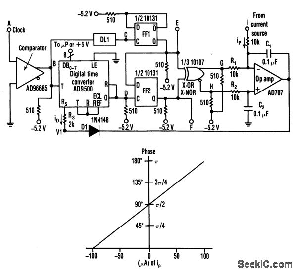 This circuit uses negative feedback to a digital-to-time converter, and can supply a current-con-trolled delay to replace the oscillator in a phase-locked loop that handles input frequencies from 40 kHz to 40 MHz.A current sourced into the inverting input of the op-arrtp integrator's summing node can phase shift the pulses at F in relation to those at E by up to 1800.