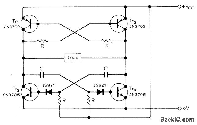 Combination of astable and bistable MVBRs, connected so diagonally opposite transistors switch on and off together, minimizes current drain in battery-powered signal generator. Period of square wave is approximately equal to 1.4CR, and peak load current can be up to 70 mA with 24-V battery supply. Circuit will tolerate wide range of values for CB.-J. C. Hopkins, Efficient Square-Wave Oscillator, Wireless World, June 1977, p 58.