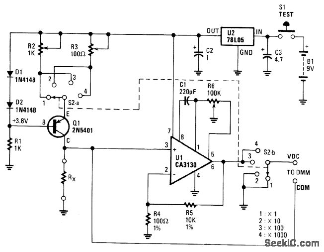 When R2 is selected, the test current is 1mA; when R3 is selected, the test current is 10mA. On the lower two ranges, ×1 and ×10, the voltage across resistance-under-test is applied directly to the DMM terminals. On the upper two ranges, op amp gain stage UI is switched into the circuit and the DMM mea-sures the voltage between op amp output pin 6 and the test resistor.