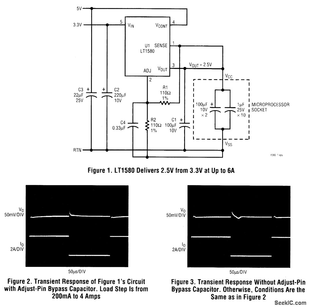 Figure 1 shows a circuit designed to deliver 2.5 V from a 3.3-V source with 5 V available for the control voltage. Figure 2 shows the response to a load step of 200 mA to 4.0 A. The circuit is configured with a 0.33-μF ADJUST-pin bypass capacitor. The performance without this capacitor is shown in Fig. 3. The difference in performance is the reason for providing the ADJUST pin on the fixed-voltage devices. A substantial savings in expensive output decoupling capacitance can be realized by adding a small ceramic capacitor at this pin.