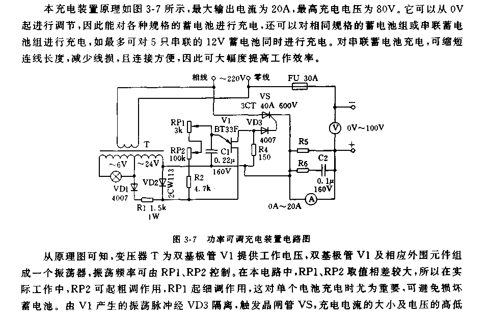 The principle of this charging device is as shown in figure 3-7, the maximum output current is 20A, the highest charging voltage is 80V. It can be adjusted from 0V, so it can charge all kinds of batteries and the battery groups or battery groups in series which have the same specifications, such as five 12V batteries in series. By charging the series batteries, we can shorten the length of wiring and reduce the power consumption, so the operating efficiency is improved.