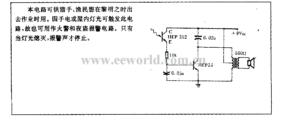 This circuit is used by hunters and fishermen when they want to work at daylight. Because the flashlight or indoor light can trigger this circuit, so it also can be used as fire alarm and burglary alarm circuit. Only the light turns off, the alarm voice will stop.