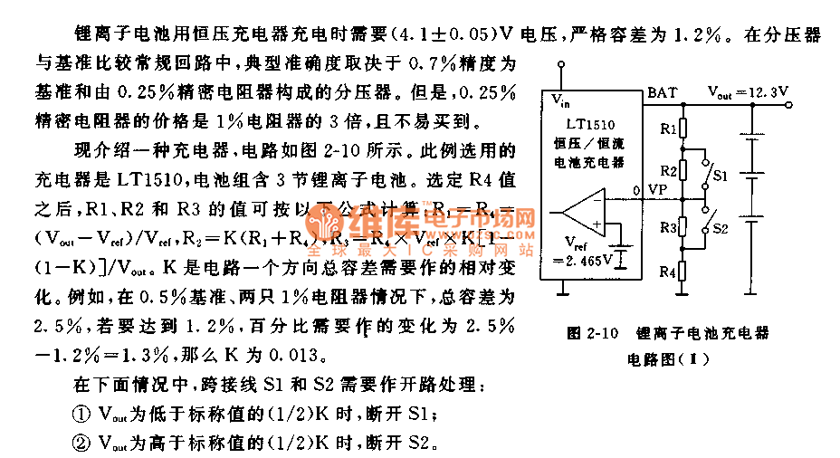 Here we introduce one kind of charger, the circuit is as shown in figure 2-10. The charger is LT1510, the battery pack has three Lithium ion batteries. If you choose the value of R4, the values of R1,R2,R3 can be calculated by the formula.