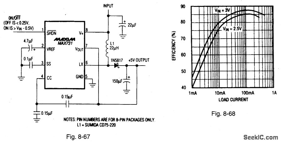Figure 8-67 shows a MAX731 connected to provide 5 V from a 3.3-V supply. Figure 8-68 shows the efficiency curves. This PWM boost regulator is designed for low-noise, battery-powered applications, such as cellular phones or sub-notebook computers without rotating disk drives (where the maximum +5-V load is 2 W or less). The input voltage range is 1.4 V to 5 V, with a quiescent current of 2 mA, and a maximum load current of 350 mA. The no-load start-up voltage is 1.8 V. The switching frequency is 170 kHz, and the shutdown current is 35 pt,A. MAXIM BATTERY MANAGEMENT CIRCUIT COLLECTION, 1994, P. 41.