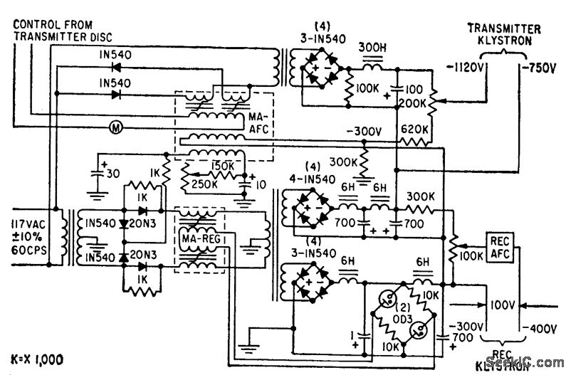 Provides stable operating voltages for transmitter and receiver local-oscillator klystrons in 6,000- Mc microwave link.-M. C. Harp, Nonvacuum Devices Control Klystrons, Electronics 32:7, p 68-70.