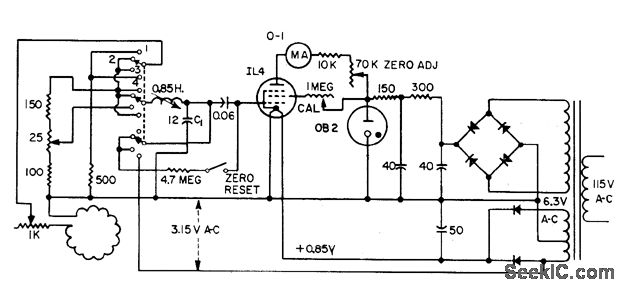 Toroid placed around one of welder electrodes develops voltage that is function of rate of change of magnetic flux produced by alternating current lowing through weld. Peak-reading a-c electronic voltmeter is used to measure resulting voltage across toroid. Selector switch positions are: 1-no signal input; 2-0 to 15,000 amp; 3-0 to 30,000 amp; 4-calibration.-J. Markus, Handbook of Electronic Control Circuits, McGraw-Hill,1959, p 326.