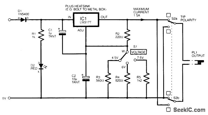 The figure shows a unit capable of offering different voltages to operate low-voltage appliances from a 12-V battery. Regulators of the LM317 type are current-limiting, short- circuit-proof, and over-heat-proof, although they are still not indestructible. This circuit will provide up to 1.5 A. IC1 should be heatsinked, perhaps by bolting it with an insulating kit to a metal box.