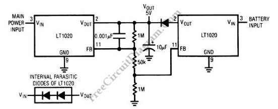 The schematic diagram shown below is a battery backup regulator circuit, useful for memory or other low power (battery operated) but critical circuit (must continue operation on powerline failure). The one LT020 will not conduct in under line-powered condition, made possible by means of of feedback string’s arrangement. In case of main power failure, the battery-driven LT1020 will turn on and maintain the load, when the line LT1020 go off because the line goes down. Here is the schematic diagram of the circuit: (source: freecircuitdiagram)
