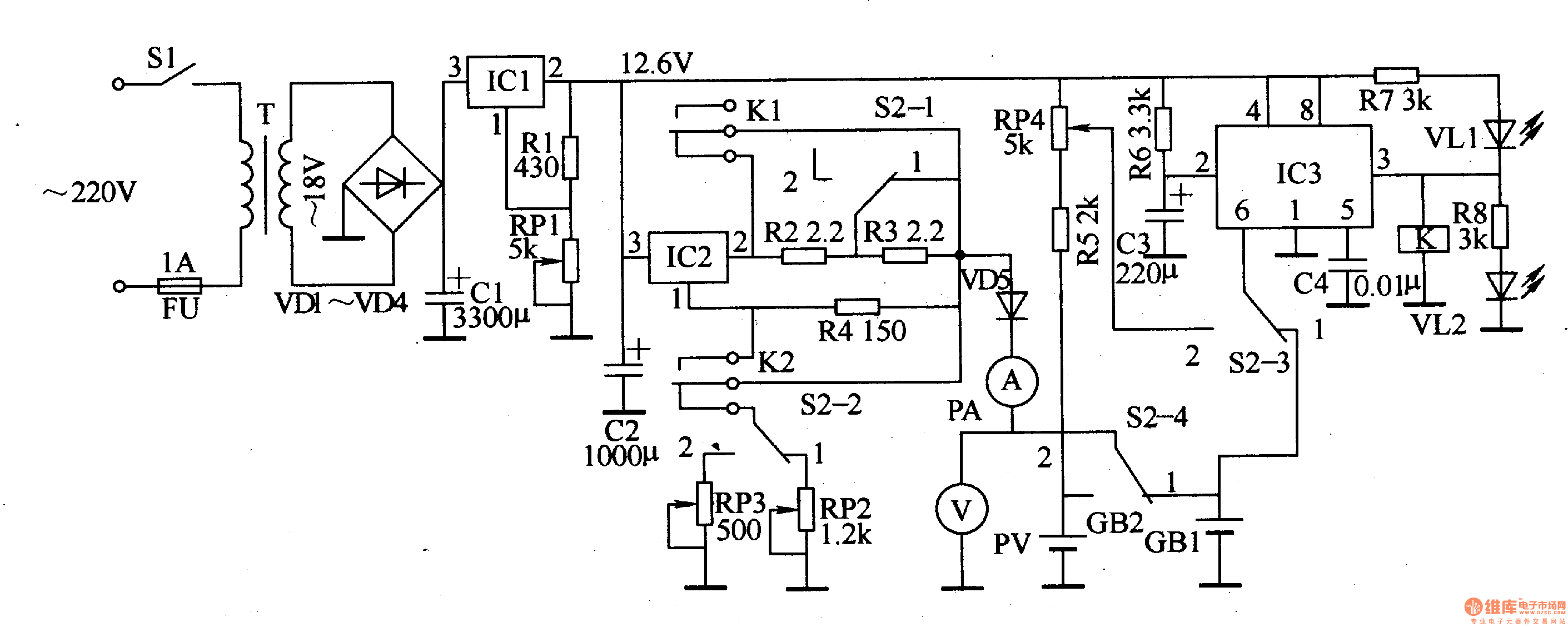 Multifuntction charger introduced in the example charges lithium-ion rechargeable battery,nickel-hydrogen battery,nickel-pick battery with constant current.It can charge two pieces of batteries at a time and become supplementary charging when the batteries are fully charged.Circuit's Work PrincipleThis charger is composed of power supply circuit and charging circuit and it's showed as the picture 5-64.Power supply circuit is composed of mains switch,S1,fuse plug,mains transformer,T,commutation diode,VDl-VD4,filter capacitor,Cl and C2,three-terminal IC,IC1,resistor,R1,and regulation resistance,RP.