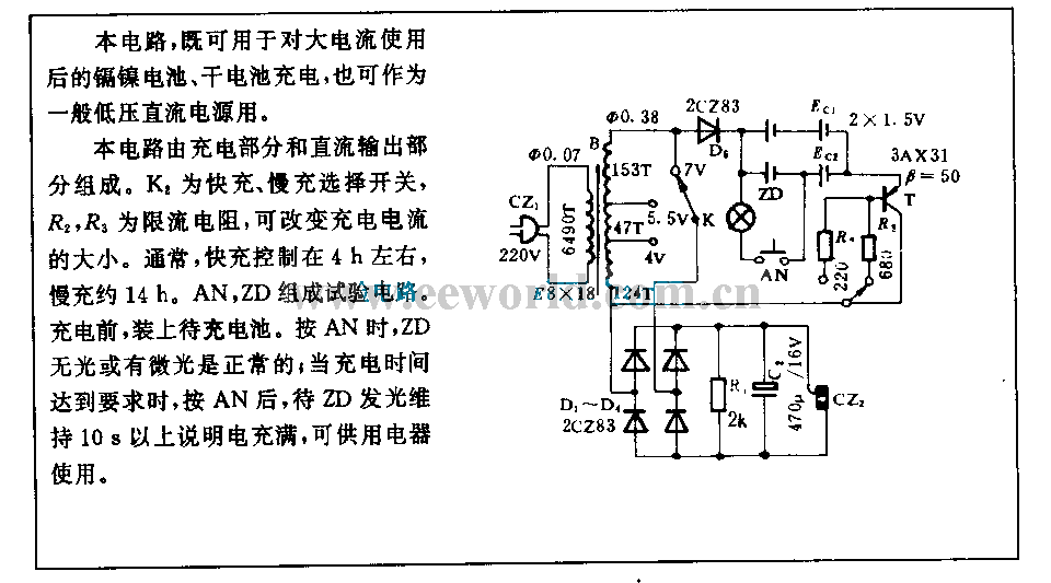 This circuit not only can charge to Ni-Cd battery and dry battery after used by large current, but also can used in general low voltage DC power supply.