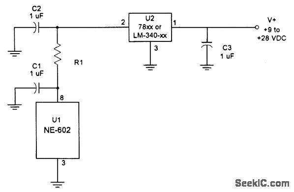This is one method of deriving the 4.5-to 8.0-Vdc supply needed by the NE602 chip.