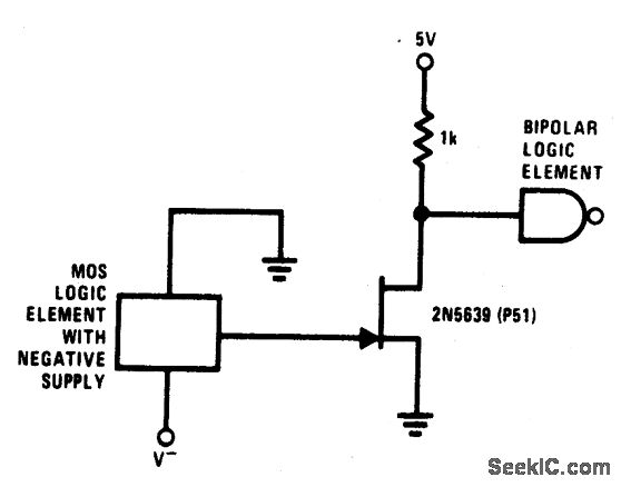 This simple circuit provides for level shifting from any logic function (such as MOS) operating from minus to ground supply to any logic level (such as TTL) operating from a plus to ground supply. The 2N5639 provides a low rdc (ON) and fast switching times.