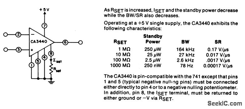 The standby-power consumption, bandwidth, and slew rate (chapter 10) of this single-supply op amp are determined by the value of RSET, as shown in the table of Fig. 8-37B. Notice that the CA3440 is pin compatible with a 741, except that pins 1 and 5 (typically negative nulling pins) must be connected either directly to pin 4 or to a negative nulling pot. Also, pin 8, the ISET terminal, must be returned to either ground or -V via RSET.