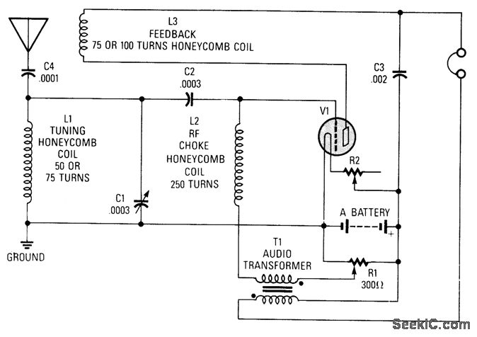 This circuit was used in the early days of radio to receive signals. Almost any battery-operated triode, such as a type 30, can be used. A battery is 3 V, R2 is a 100-Ω rheostat. Coils are typically 2 to 3 diameter honeycomb wound.