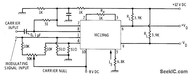 Motorola MC1596G double-balanced modulator has carrier input between pins 8 and 7 and modulation between pins 1 and 4. Balancing carrier-null circuit, also connected between pins 1 and 4, contributes to excellent carrier rejection at output. For unbalanced output, ground one of push-pull output terminals. Requires two supplies.-E. M. Noll, Linear IC Principles, Experiments, and Projects, Howard W. Sams, Indianapolis, IN, 1974, p 138-139.