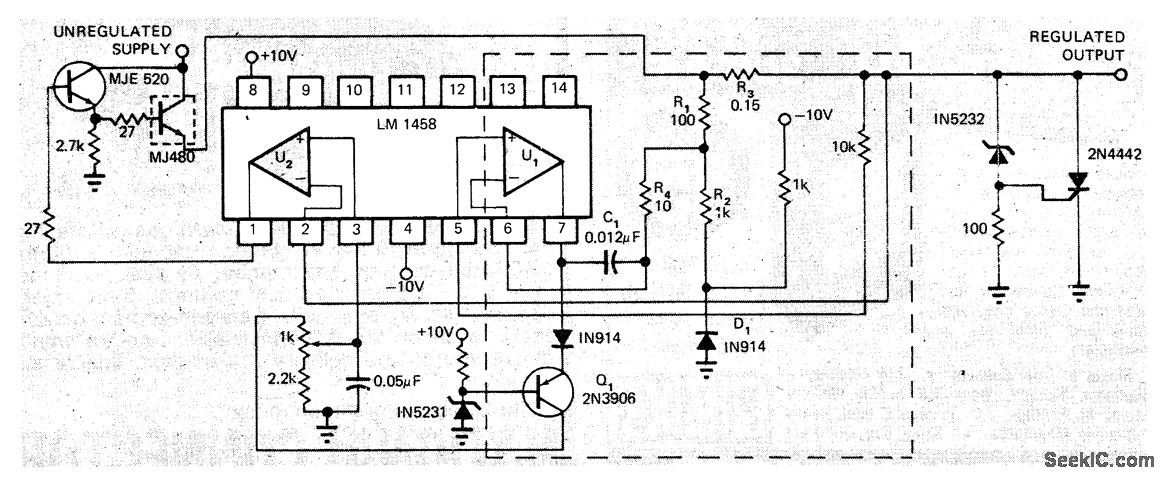 Components within dashed lines protect regulator IC from over current condition frequently encountered when zener-SCR crowbar is used across output.Regulated output is 5 V with IC shown. Article gives operating details of circuit and equation for shutdown time, which is about 1 s.-S. J. Pirkle, Circuit Protects Power Supply Regulator from Overcurrent, EDN Magazine, Feb. 5, 1973, p89.