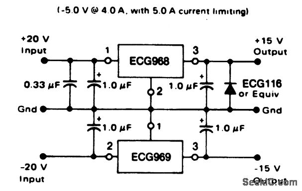 Operational amplifier ±15-volt 1-ampere power supply. The ECG968 and ECG969 positive and negative regulators can be connected as shown to obtain a dual power supply. A clamp diode should be used at the output of the ECG968 to prevent latch-up problems. The regulators have thermal-overload and short-circuit protection. The input capacitors should be 0.33 μF if tantalum or Mylar, or 1.0μF if aluminum. Bypassing the output is also recommended. The same type of dual power supply can be constructed with other ratings of the ECG9XX series of regulator. Ratings are as follows: ECG960, +5 volts; ECG961, -5 volts; ECG962, +6 volts; ECG963,-6 volts; ECG966, +12 volts; ECG967,-12 volts; ECG968; +1 5volts, ECG969,-15 volts; and ECG972, +24 volts (courtesy GTE Sylvania Incorporated).