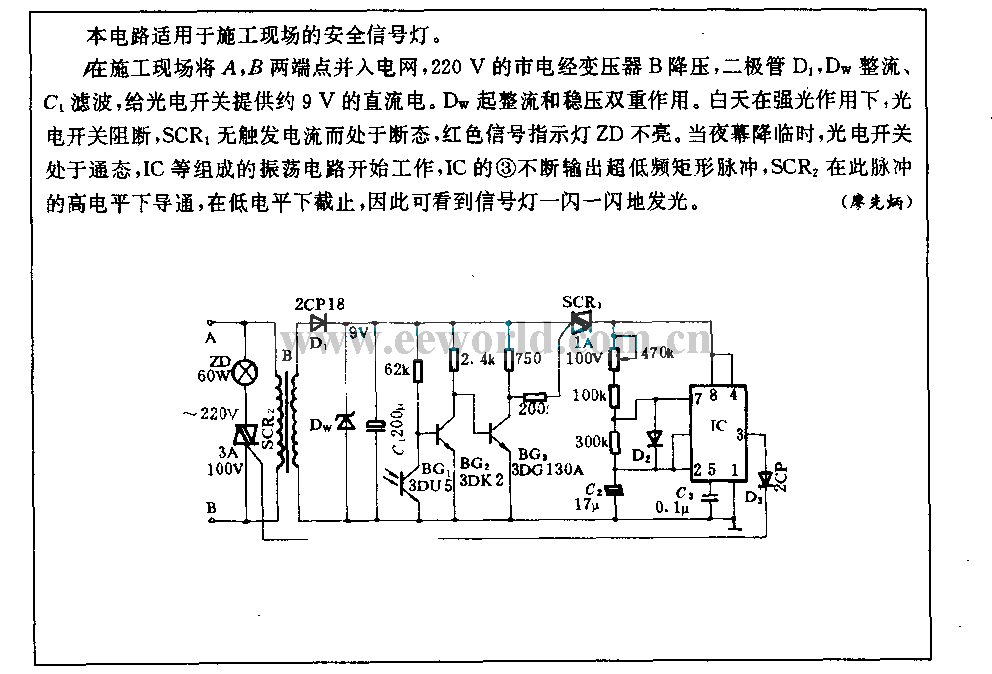 In construction site, A, B terminals are connected to power network, 220V mains supply is reduced by transformer B, it is rectified by Dw and filtered by C1, it provides photoelectric switch with 9V DC power. Dw takes the action of rectification and voltage regulation. Under bright light during the day, photoelectric switch cuts off, SCR1 has no trigger current and it is in off state, the red singal indicator light ZD does not turn on. When night comes, photoelectric switch turns on, the oscillation circuit which is composed of IC starts to work, IC's ③ constantly outputs ultra-low frequency rectangular pulse, SCR2 is conduction under this pulse's high level, and it is closed under the low level, so we can see the singal light winking.