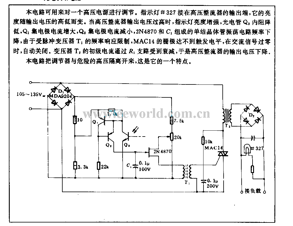 This circuit can be used to adjust a high voltage power supply. Indicator light #327 is connected to the output terminal of high voltage rectifier, its brightness changes in relation to output voltage. When the output voltage of high voltage rectifier is too high, the brightness of indicator light increases, the resistance of phototube Q3 reduces, Q1 collector current increases, Q2 collector current decreases, the frequency of unijunction transistor oscillation circuit composed of 2N4870 and C1 drops, limited by the frequency response of pulse transformer T1, MAC14 grid can not reach the trigger level, when the AC singal is zero passage, the light turns off automatically. The primary current of transformer T2 is reduced by R1 branch, then the output voltage of high voltage rectifier drops.